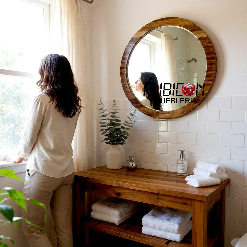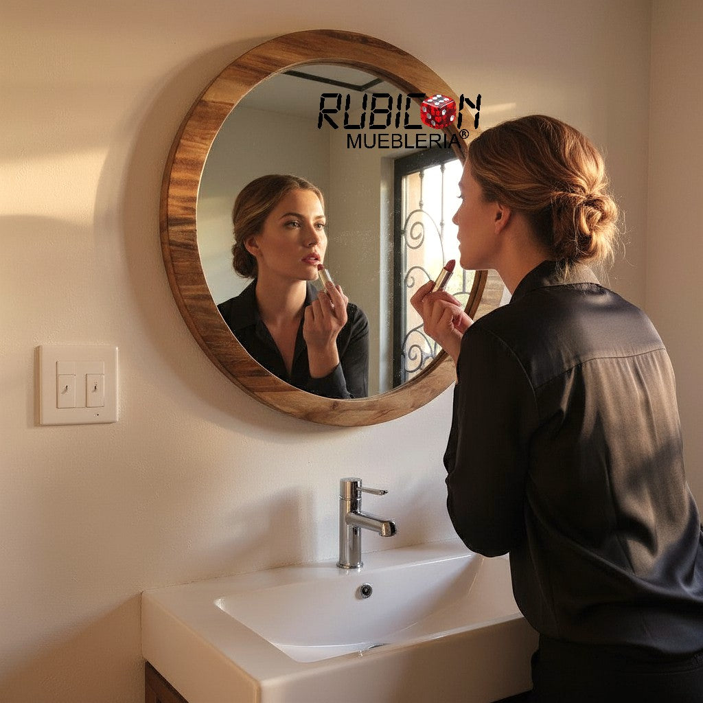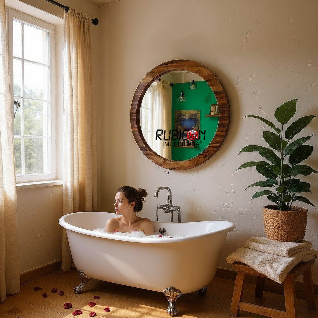 Espejo de parota mod. Lightning con un diseño minimalista y singular que resalta en cualquier lugar de tu hogar. Disponible en diferentes diámetros, con un grosor del marco de 4 cm.